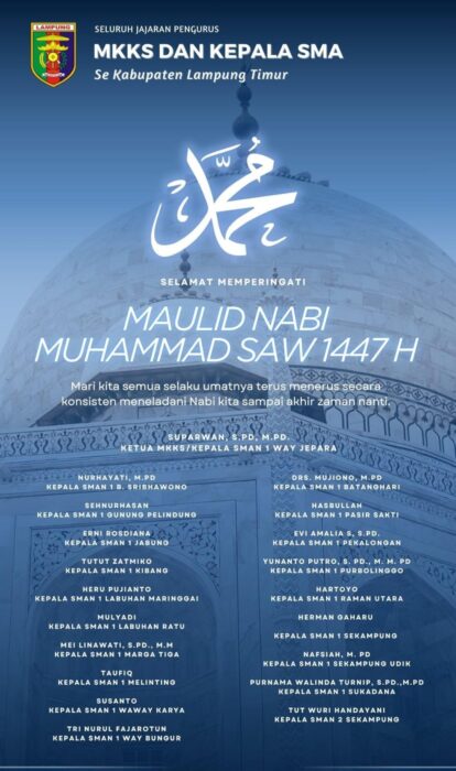 LAMTIM – Sigerlink.com, Seluruh jajaran Forum Musyawarah Kerja Kepala Sekolah (MKKS) dan kepala SMA se-Kabupaten Lampung Timur menyampaikan ucapan selamat dalam memperingati Maulid Nabi Muhammad SAW 1447 H/2025 M yang jatuh pada Jumat, 5 September 2025.