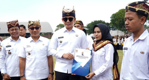 Ribuan penerima SK tampil seragam mengenakan kemeja putih dan celana hitam. Suasana semakin khidmat dengan sentuhan aksesoris adat daerah, seperti tukus bagi laki-laki dan selendang tapis bagi perempuan, sebagai simbol identitas dan kebersamaan.
