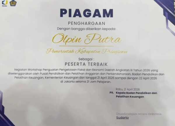 Dalam kegiatan Workshop Penguatan Pengelolaan Fiskal dan Ekonomi Daerah Angkatan III Tahun 2026, Pemkab Pringsewu berhasil meraih penghargaan sebagai Peserta Terbaik.
